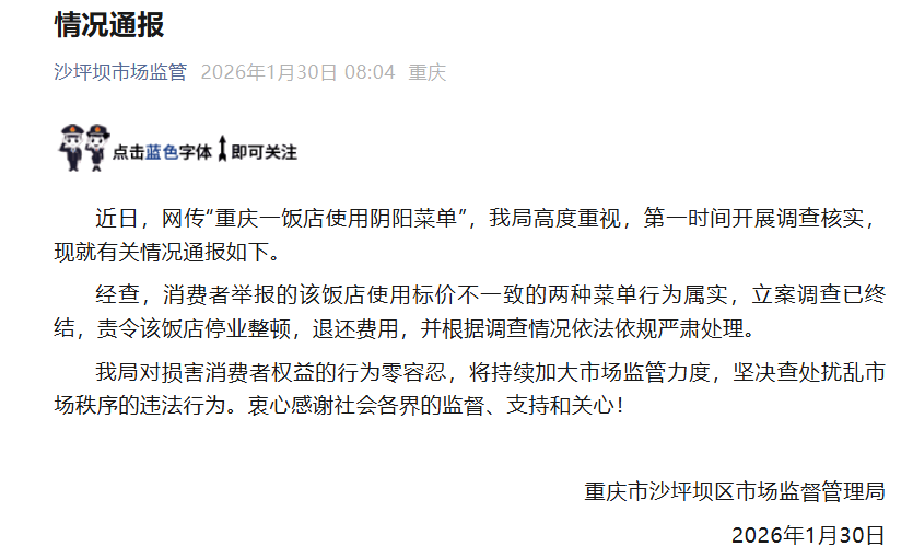 近日,网传“重庆一饭店使用阴阳菜单”,我局高度重视,第一时间开展调查核实,现就有关情况通报如下。