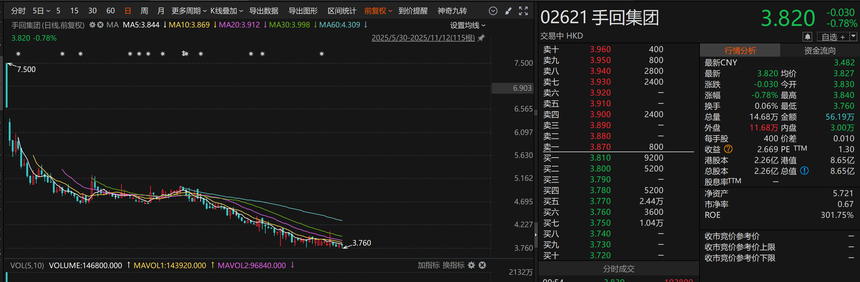 上证报中国证券网讯(记者 何奎)11月12日,港股上市公司手回集团股价盘中最大跌幅约2.34%,股价一度下跌至3.76港元每股,创下历史新低。自5月30日上市以来,手回集团股价经历了开盘价破发、上市首日破发、创历史新低的“跌跌不休”行情,当前股价较8.08港元每股的发行价跌幅超过50%。
